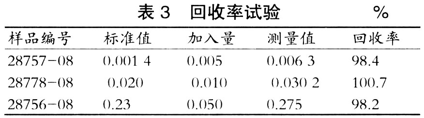 同时测定以下三个试样及在试样中加入标准溶液,根据测量值差计算回收率,结果见表3。