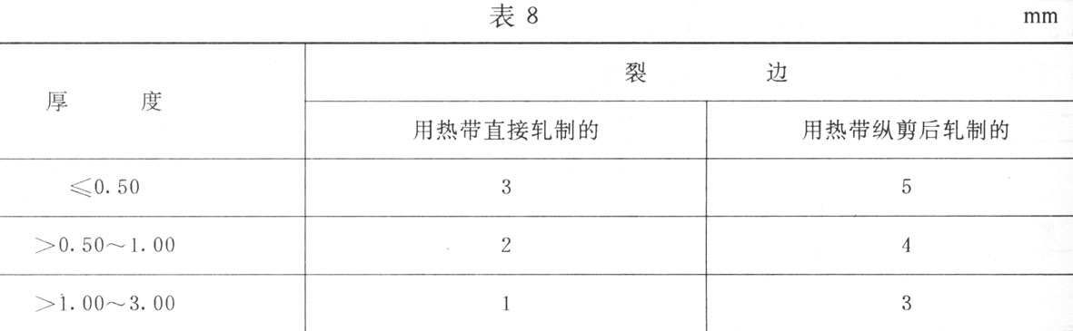5.6 在不切边钢带的边缘上允许有深度不大于表8规定的裂边。