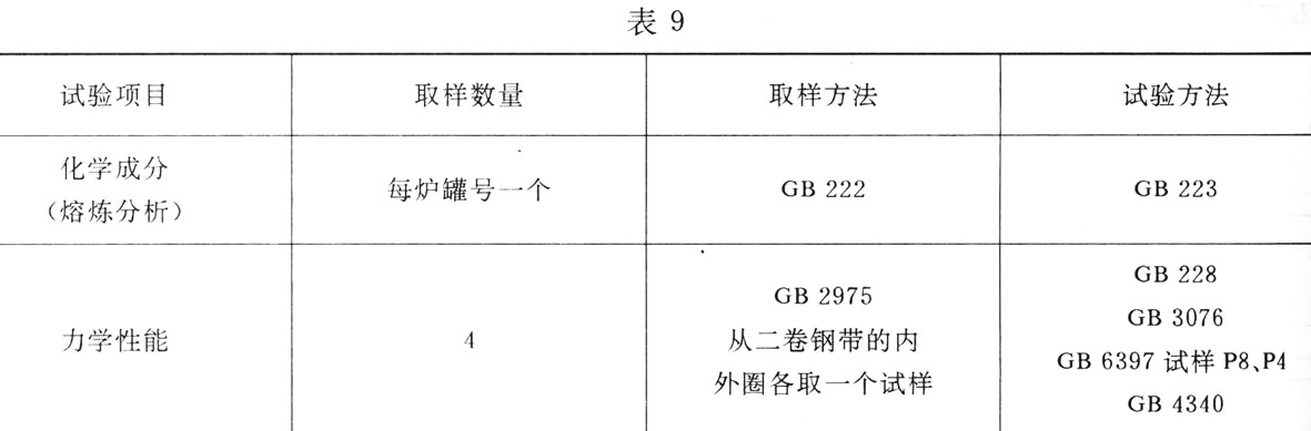 6.5每批钢带的试验项目、取样数量、取样方法和试验方法应符合表9的规定。