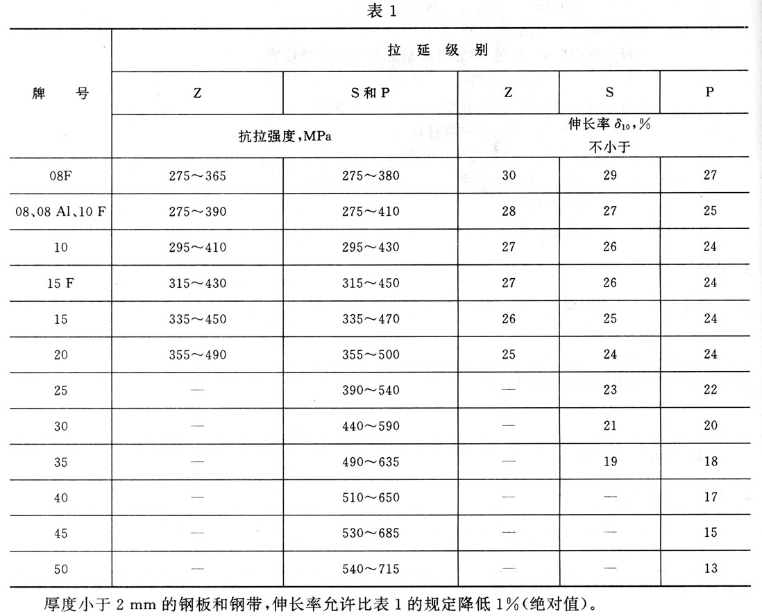 正火状态下供应的钢板和钢带,其他要求符合本标准规定时,抗拉强度允许比表1规定的上限提高50 MPa。