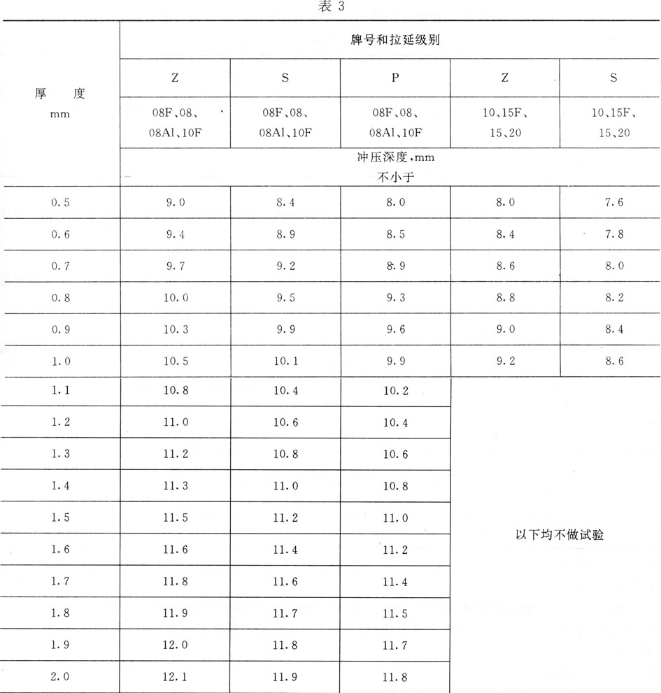 中间厚度的钢板和钢带,其杯突试验值按表3接近的小尺寸厚度钢板和钢带的冲压深度数值规定。