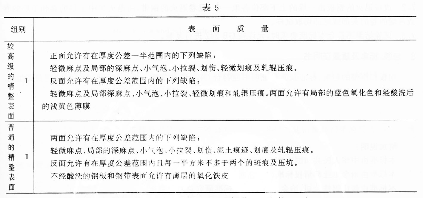 5.6.3 钢板和钢带的表面质量应符合表5的规定。但允许有的缺陷深度不应超过钢板和钢带的最小厚度。