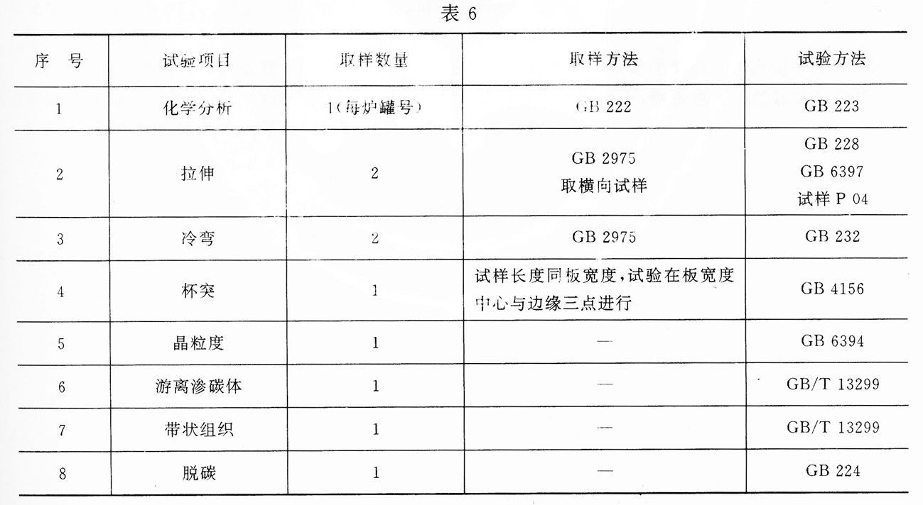 6.2 每批钢板和钢带的试验项目、取样数量、取样方法和试验方法应符表6的规定。表6序号2~8试验项目的取样数量是指一张(卷)试验用钢板(卷)的取样数量。