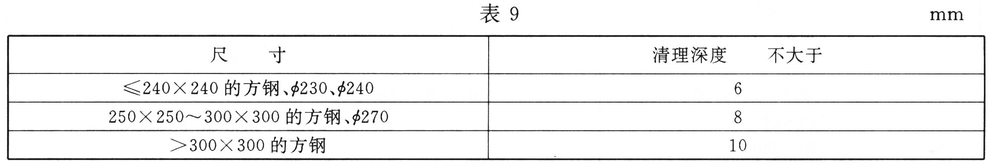 a)清理时要沿钢材的长度方向进行,其边缘应平滑过渡;清理的宽深比应不小于6:1。清理深度(从实际尺寸算起)应符合表9的规定;