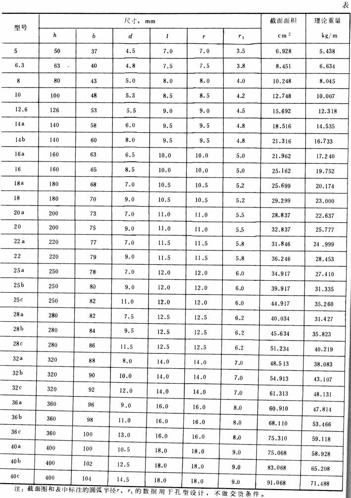 2.1.2槽钢的尺寸、截面面积、理论重量及截面特性参数应符合表l的规定。