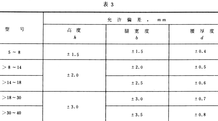 2.1.4.1 槽钢的高度h、腿宽度b、腰厚度d尺寸允许偏差应符合表3的规定。