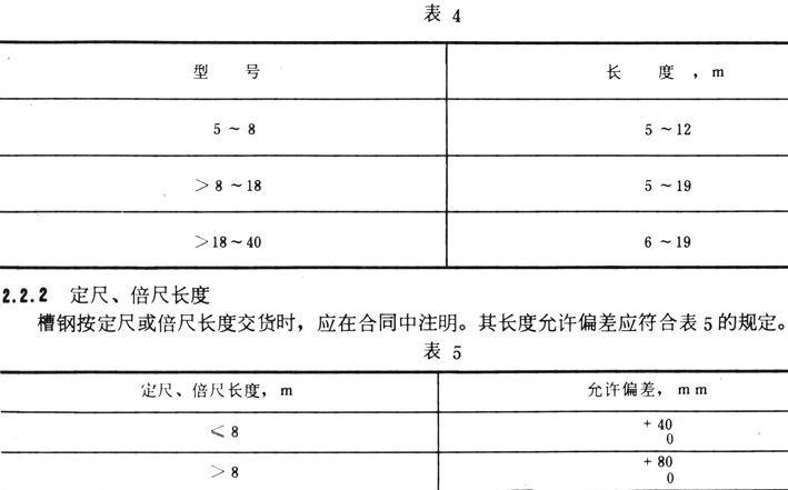槽钢按定尺或倍尺长度交货时,应在合同中注明。其长度允许偏差应符合表5的规定。