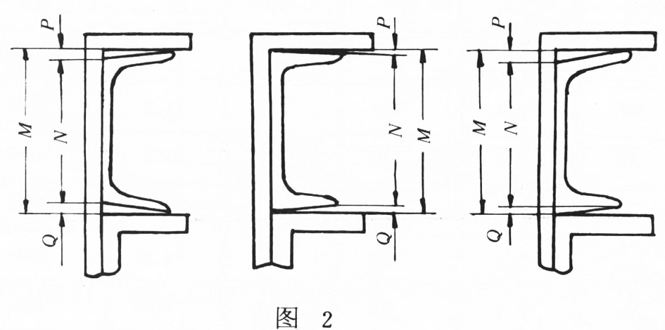 6.1.4 检查腿的外缘斜度按图2,用样板测量P和Q及M与N之差的绝对值,不得超过本标准2.1.4.4规定。