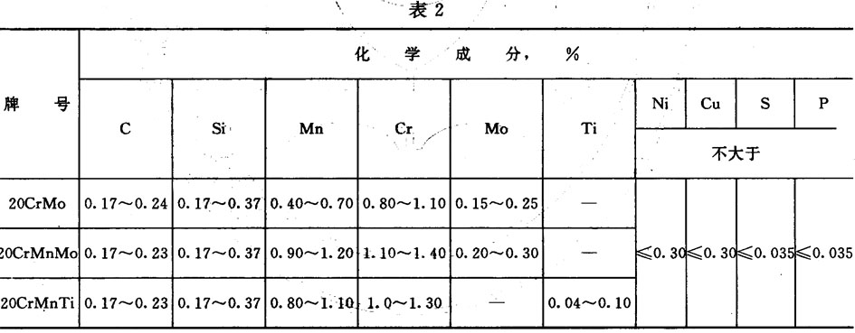 5.1.1 销轴用钢材应用20CrMo、20CrMnMo、20CrMnTi钢制造,其化学成分(熔炼分析)应符合表2的规定。
