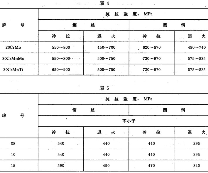 钢材应检验交货状态的抗拉强度,销轴、滚子用钢的抗拉强度应分别符合表4、表5的规定。