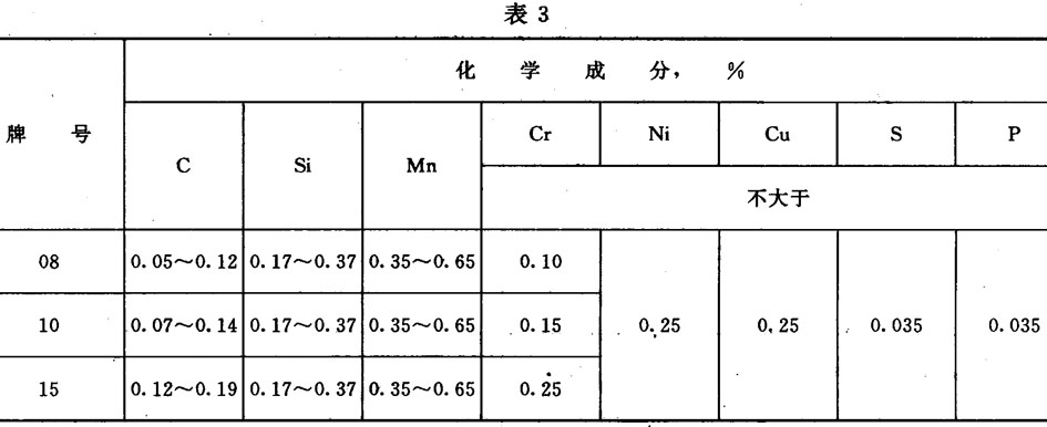 5.1.2滚子用钢材应用08、10、15钢制造,其化学成分(熔炼分析)应符合表3的规定。