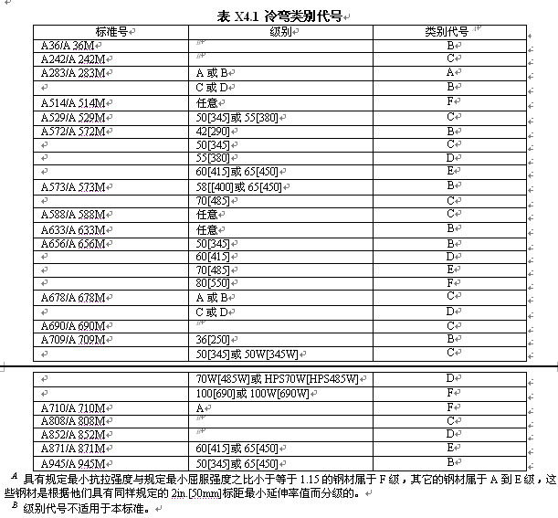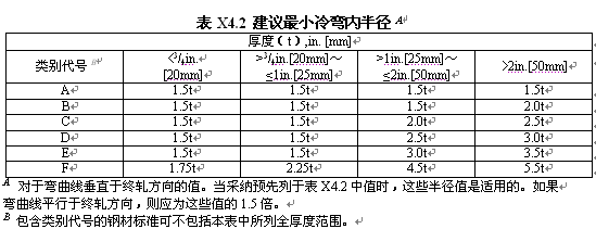 X4.1 建议最小冷成形弯曲内半径参见表X4.1规定的类别代号A和F的内容。列于表X4.2中的建议半径应在典型的车间生产中作为最小值使用,按照表X4.2生产,其材料不能令人满意,在与钢材的供方协商之前可以拒收。当要求更严格的弯曲时,应与制造者协商。