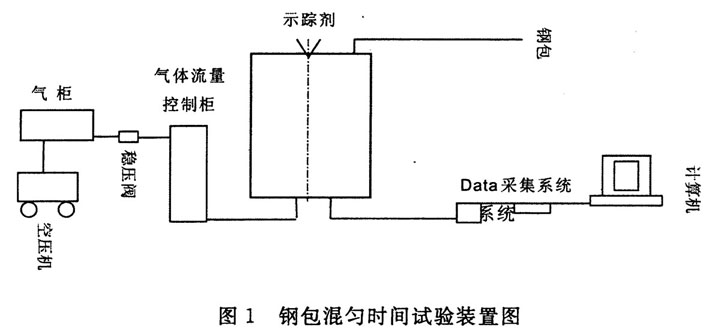 物理试验采用空气模拟惰性气体氩气,空压机供气压力为0.2 MPa~0.4 Mpa,采用液态水模拟钢水流动。根据吹气口位置和探测点位置空间分布特点,以饱和食盐水作为刺激响应源,调节气量值,测定钢水混匀时间。试验装置图见图1。